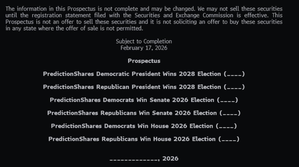Công ty quản lý tài sản tiền điện tử Bitwise đã nộp đơn lên Ủy ban Chứng khoán và Giao dịch Hoa Kỳ (SEC) để ra mắt một loạt sáu quỹ giao dịch chứng khoán (ETF) dưới thương hiệu mới "PredictionShares", được thiết kế để theo dõi các hợp đồng sự kiện nhị phân gắn liền với kết quả bầu cử Hoa Kỳ trong tương lai.