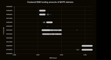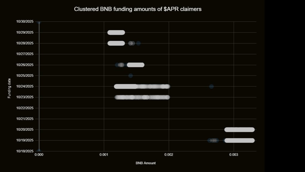 More than 14,000 wallets received airdrops funded by nearly identical BNB transfers — each receiving about 0.001 BNB from centralized Binance-affiliated addresses over short periods of time. The claim patterns are grouped by funding date, particularly between October 19 and 29, suggesting a pre-programmed or automated claim process.