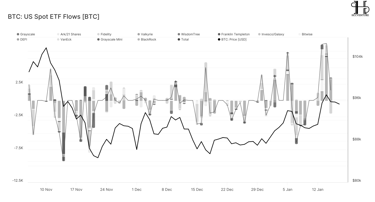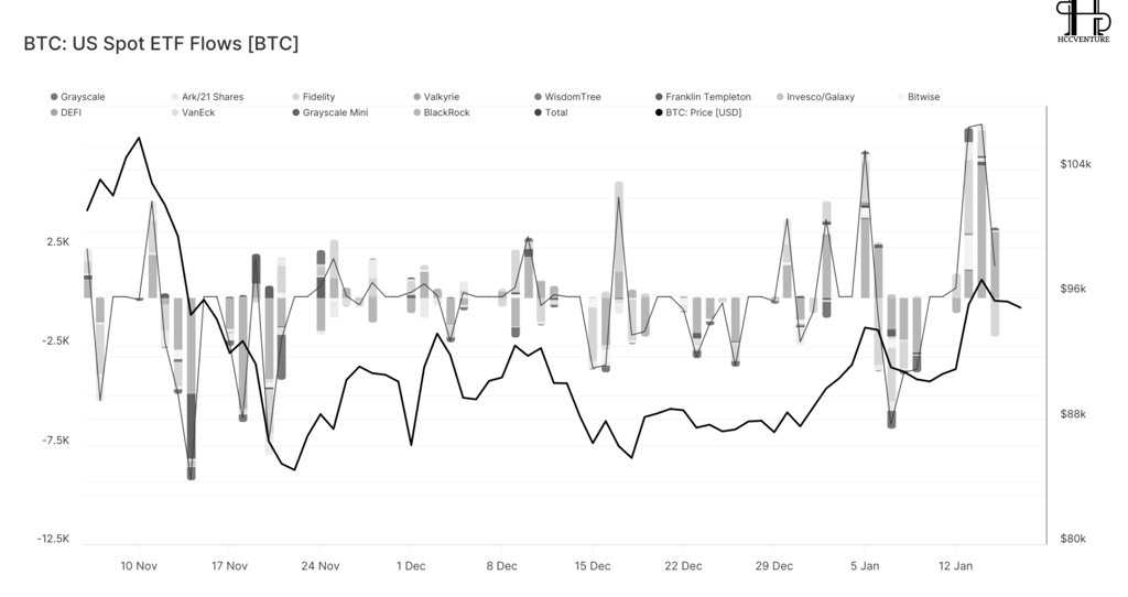 The Ethereum ETF shows a similar trajectory but with smaller amplitude and a clear lag . Despite experiencing weeks of negative or neutral inflows in December, the ETH ETF shifted to a stable inflow from the end of the month and reached nearly $100 million in the most recent week.
