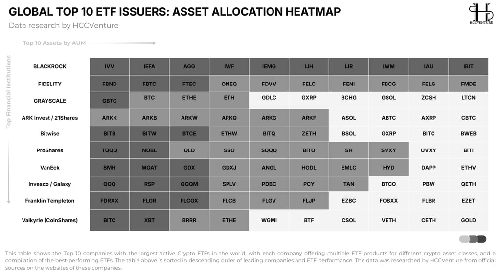 This heatmap provides a very clear picture of how major financial institutions are positioning crypto within their global ETF portfolios . The most striking point is that crypto is no longer a "separate branch," but has been directly integrated into the core ETF ecosystems of leading issuers.
