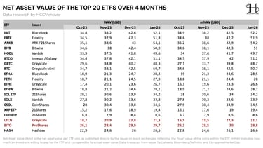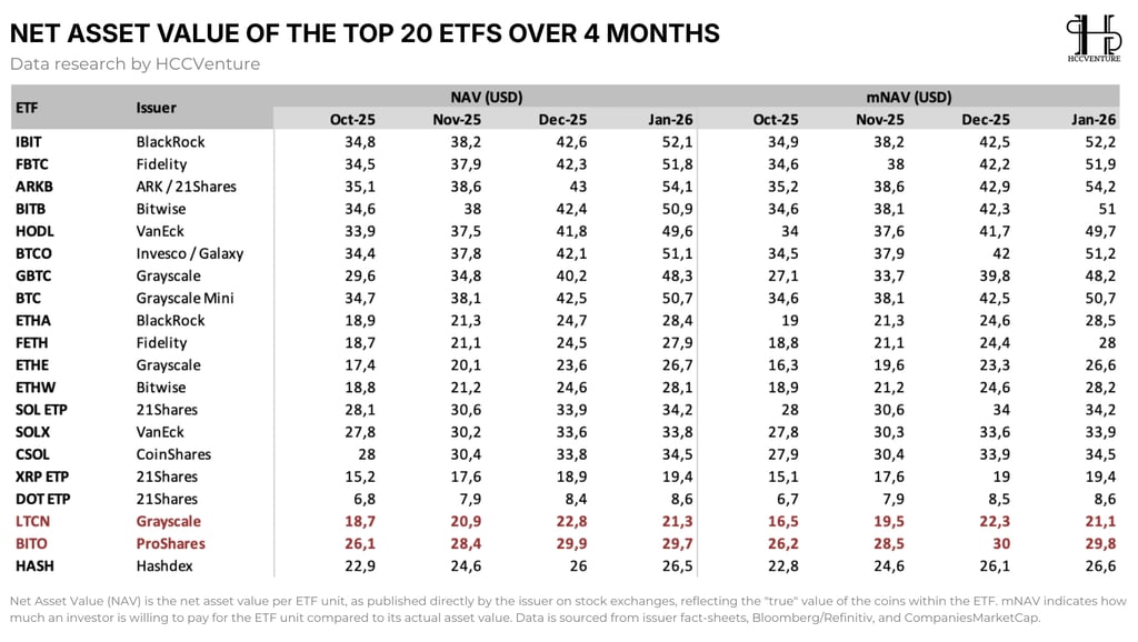 The NAV and mNAV statistics of the Top 20 Crypto ETFs show a very clear signal: the intrinsic value of crypto ETFs is increasing synchronously across the board , reflecting sustainable demand for the underlying asset rather than short-term speculative fluctuations. Most large spot Bitcoin ETFs such as IBIT, FBTC, ARKB, BITB, and BTCO have recorded strong NAV increases in the most recent month, with prices above $50, indicating that Bitcoin is being accumulated through the ETF channel with high intensity . This is a typical sign of institutional capital flow, as BTC purchases occur regularly through the ETF basket mechanism rather than direct buying and selling on the spot market.