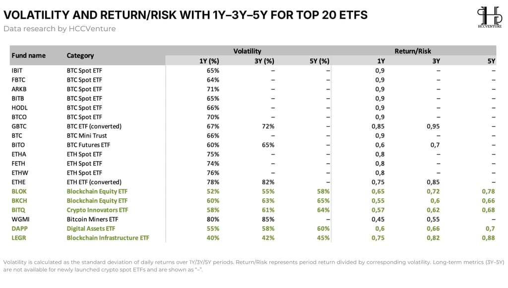 The Blockchain Equity ETF and Infrastructure ETF group (BLOK, BITQ, DAPP, LEGR) shows a completely different risk-reward profile. The volatility of this group is significantly lower (40–60%), while the return/risk ratio gradually improves over time , even reaching 0.88 in LEGR over the 5-year timeframe .