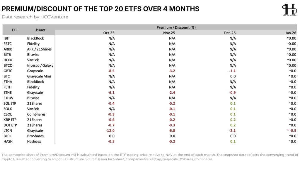 The near-complete disappearance of deep discounts (-5% to -10%) across the entire current data table is noteworthy. In the context of crypto ETFs, deep discounts are typically associated with three negative factors: net capital outflows, poor liquidity, and weakened confidence. The absence of this phenomenon suggests that the crypto market is not currently under systemic selling pressure from the ETF channel ; instead, it is in equilibrium – and even being supported by new capital inflows.