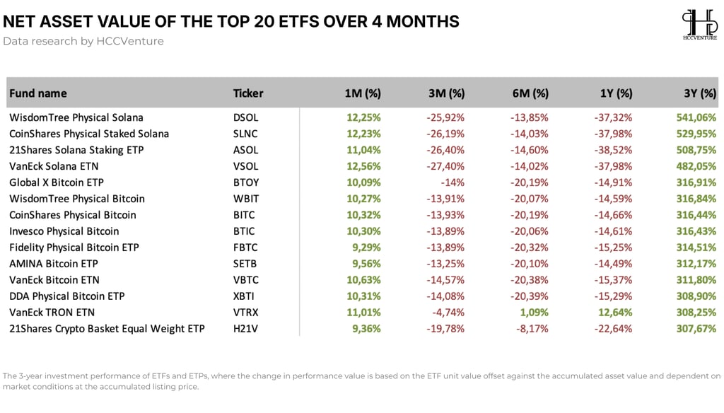 However, when expanding to the 3-month and 6-month timeframes , performance remains negative across most products, particularly the Bitcoin ETP and Solana ETP groups. This reflects that current capital flows are primarily recovery and accumulation , rather than strong enough to completely reverse the medium-term trend. Investors are buying after previous deep price corrections, rather than chasing a rapid upward trend. This is characteristic of a "controlled re-risking" phase, where capital prioritizes timing over increasing leverage.