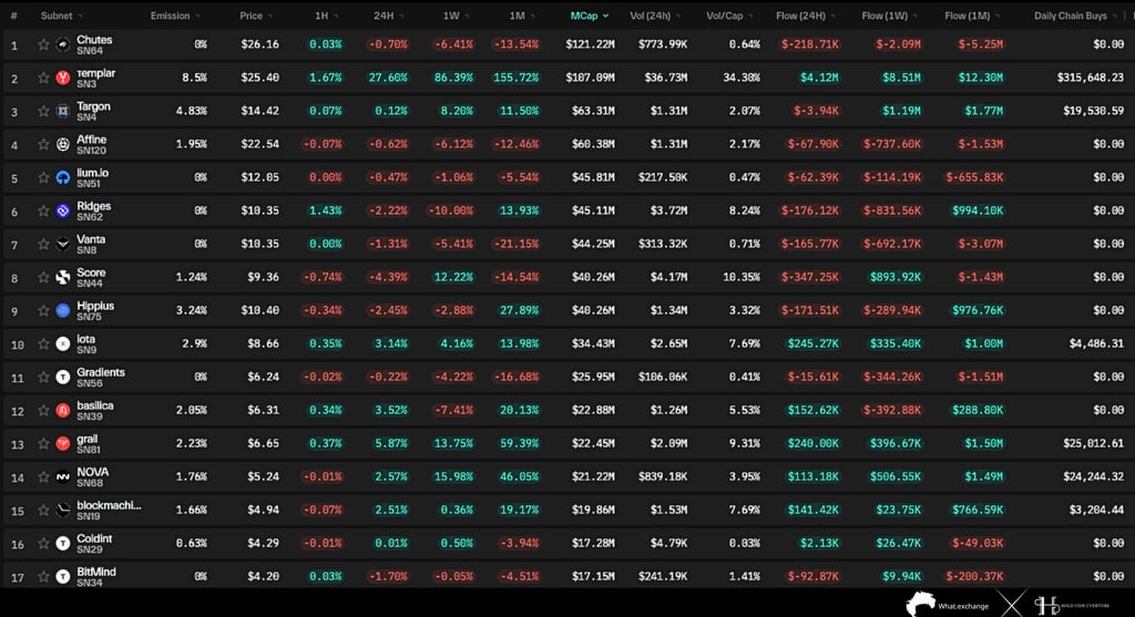 Currently, the market structure shows a clear divergence between leading subnets and the rest. Subnets like Chutes (SN64) and Templar (SN3) account for the largest share of market capitalization, with market caps of approximately $121 million and $107 million respectively . However, the notable difference lies in the cash flow. While Chutes recorded negative net cash flow in the 24-hour (-$218,000), 7-day (-$2.09 million), and 1-month (-$5.25 million) timeframes, Templar attracted strong capital inflows of +$4.12 million (24h), +$8.51 million (1W), and +$12.3 million (1M) . This reflects a structural shift in cash flow, where capital rotation is occurring from "older" subnets to those with higher narrative or performance.