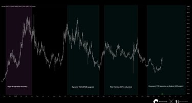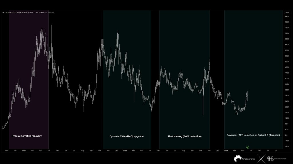 In the initial phase, from late 2023 to Q1 2024, the price of TAO experienced a strong surge, taking the asset from below $100 to a peak of nearly $700–750, equivalent to an increase of more than seven times. This surge coincided with the "AI narrative recovery" wave, as speculative capital and technological expectations focused heavily on projects related to artificial intelligence.