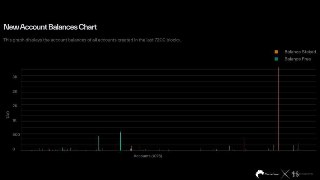 Direct observation from data distribution reveals a total of approximately 1,075 new accounts , with the majority having very small capital sizes, ranging from under 50–100 TAO . However, the notable point is the emergence of large-scale outliers, particularly some accounts with staked balances exceeding ~3,000 TAO , along with many groups of accounts in the 300–600 TAO range . This indicates that the new capital inflow is not purely from small retail investors, but shows clear participation from large-scale entities at the time of entry.