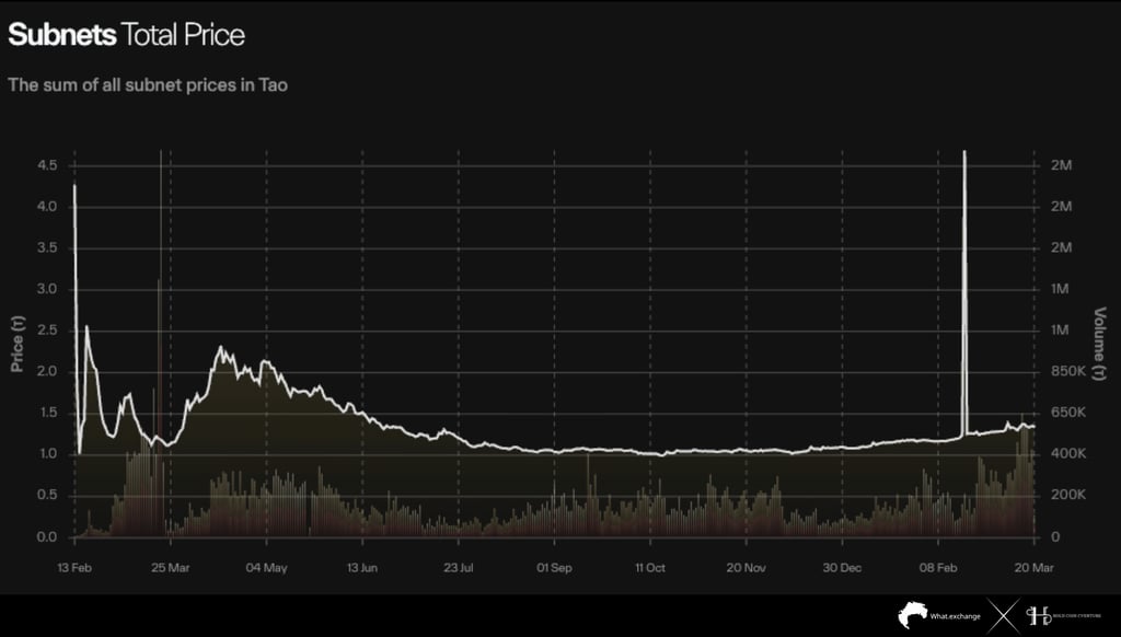 However, since the end of last year, the market structure has begun to change. The total subnet price has remained stable around ~1.0–1.2 TAO , then gradually formed a slight upward trend to ~1.3–1.4 TAO . The important thing is not the absolute increase, but the stability of the price base – a signal that the market has completed its correction and entered an accumulation phase.