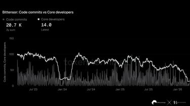 Compared to past peaks (~100 developers), the current level (~14) represents a decline of over 85% in the core development workforce. This is a significant quantitative change, because in crypto valuation models based on fundamentals, the number of developers is often seen as a proxy for the project's "intellectual capital." A sharp decline in this variable is often associated with the risk of slowing innovation and limiting the ecosystem's scalability.