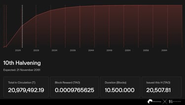 With the current circulating supply at approximately 20.98 million TAO , the system is very close to supply saturation, with the majority of tokens already issued to the market. The current block reward has decreased to ~0.000976 TAO/block , reflecting that the rate of new issuance has entered a sharp decline, in line with the cyclical deflationary design.