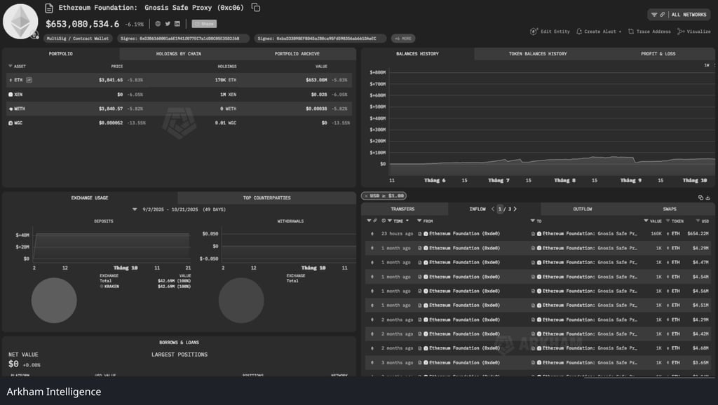 On October 21, 2025, blockchain data shows the Ethereum Foundation transferred about 160,000 ETH (about $654 million) to a wallet address previously flagged by analytics firm Arkham Intelligence for “dump” transactions or transactions involving exchanges.