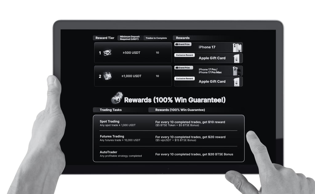 BTSE has just officially launched the Trade & Treat 2025 event, giving users the opportunity to receive iPhone 17 series, Apple Gift Cards and USDT bonuses when depositing and trading on the platform.