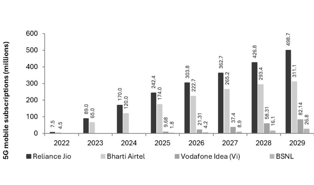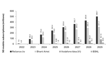 5G base stations: over 500,000 stations in operation (Reliance Jio leads with approximately 60% market share)