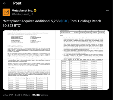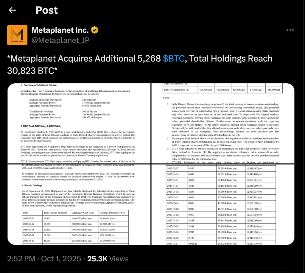 The deal was executed last week at levels below $117,000, reflecting a buyback on BTC’s brief dip from its high of $120,000. The total purchase price is now $3.33 billion for 30,823 coins, with an average purchase of $107,912 – resulting in an unrealized gain of $270 million at spot prices. This far exceeds Metaplanet’s September buyback of 5,419 BTC for $632.53 million, which vaulted the firm into the top five.