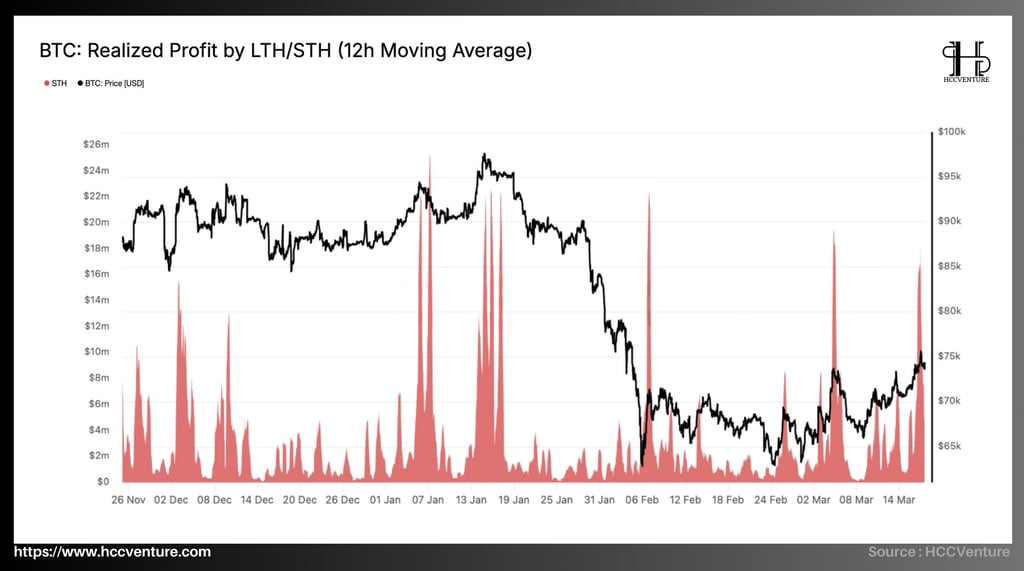 The chart clearly shows that throughout the recovery phase from early February 2026, when Bitcoin's price bounced from its cyclical lows, STH's realized profit experienced a series of sharp peaks. Most notably, last week's move: as the price approached and surpassed $74,000, the 12-hour moving average of STH Realized Profit surged to $18.4 million per hour – the highest level since the spike peaks in January 2026.