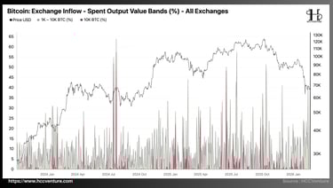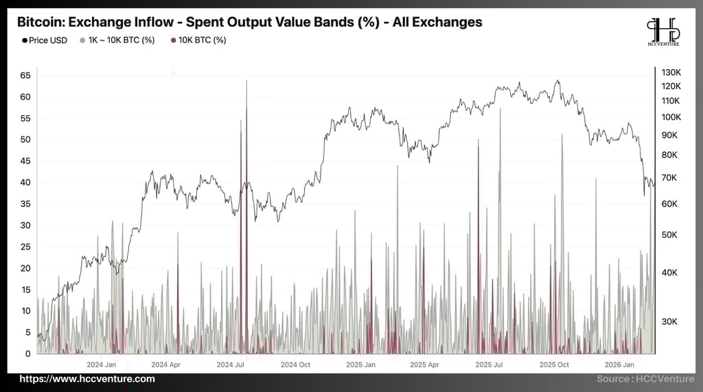 Throughout 2024–2025, major inflow bands recorded several strong spike peaks, with the 10K BTC ratio (red line) reaching record highs of over 50% at several cyclical transition points, particularly in mid-2024 and during the sharp fluctuations at the end of 2025, corresponding to the period when supply on exchanges was still abundant and realized profits of STH peaked.