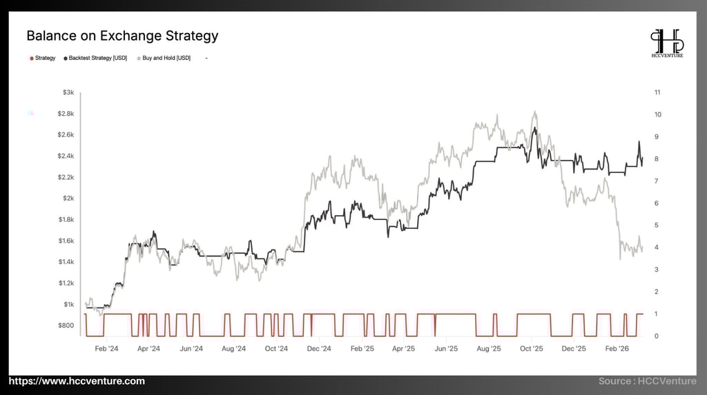 However, from late 2025 to February 2026, the gray line plummeted sharply to a low of around $1,500, fully reflecting the impact of the recent drawdown as supply on the exchange remained in excess during some transitional phases. Conversely, the Backtest Strategy of Balance on Exchange maintained a more stable trajectory, peaking at around $2,700 during the same period and ending the phase at around $2,500 – significantly higher than the Buy and Hold strategy at the present time.