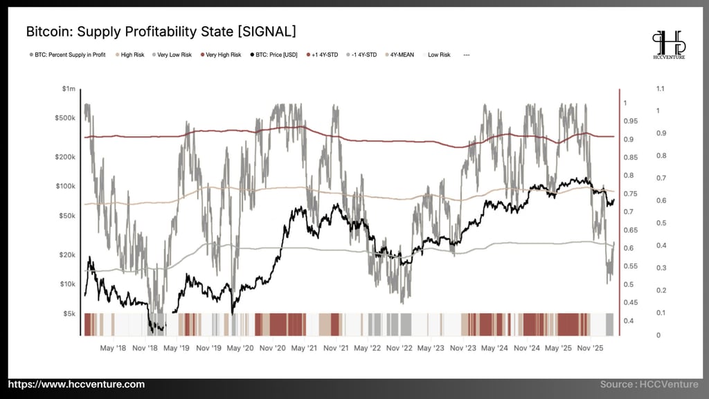 The Supply Profitability State chart from HCCVenture clearly illustrates the journey of this indicator through multiple cycles. History shows that every recovery from deep bear market bottoms into the early bull market phase is confirmed when the indicator climbs from below the -1 standard deviation (around 60%) to the long-term average of 75% . Recent price movements have pushed the Percent of Supply in Profit to exactly 60% , perfectly consistent with the initial bounces at the bottoms of previous cycles, where market exhaustion often appears on the first attempt at recovery.