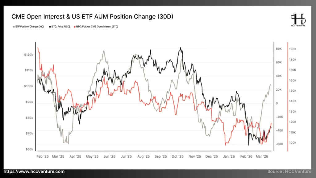 The sharp increase in ETF Position Change (30D) while CME open interest has not yet expanded suggests that institutional investors are re-entering the market in the early stages, prioritizing safe spot exposure over high leverage risk. If CME open interest begins to expand in parallel with continued ETF inflows, this would be a clear sign of growing conviction, pushing the recovery from a technical to a sustainable trend.