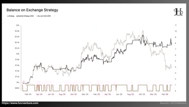 The Balance on Exchange Strategy clearly highlights the difference in performance between the two approaches. The Buy and Hold strategy peaked at around $2,800 by the end of 2025, accurately reflecting Bitcoin's strong upward momentum as the price reached cyclical highs.