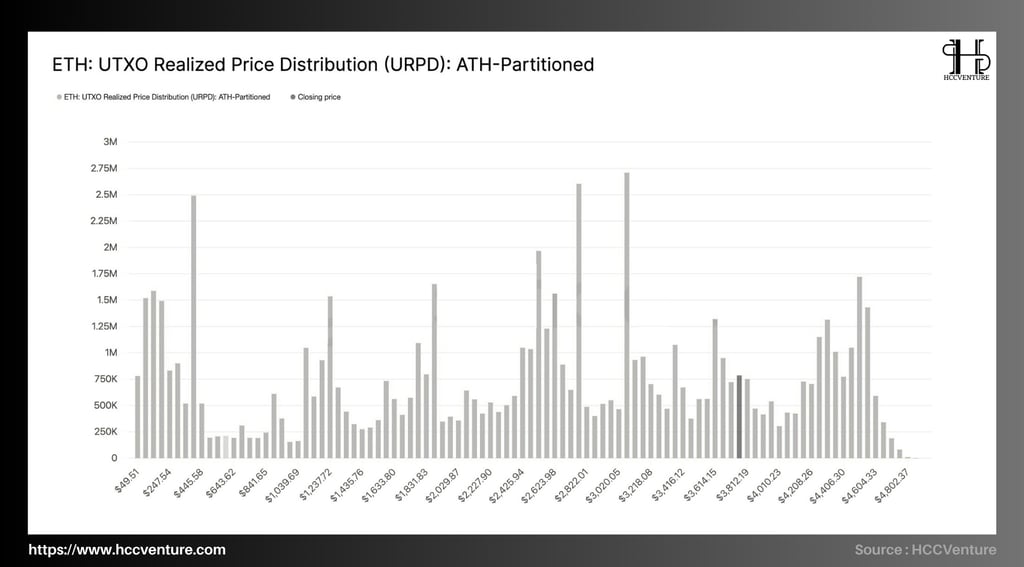 In the 2021 cycle, URPD was concentrated in the $3-4k range and sparse in the >ATH range , then the price declined sharply because overhang quickly appeared when old investors sold. Currently, the $4.10-4.60k range has become the new cost-basis for most capital flows, while there is no equivalent thick band above . This shows acceptance of high valuations rather than "collective peak chasing"; the risk of systematic selling at the peak is lower than in 2021.