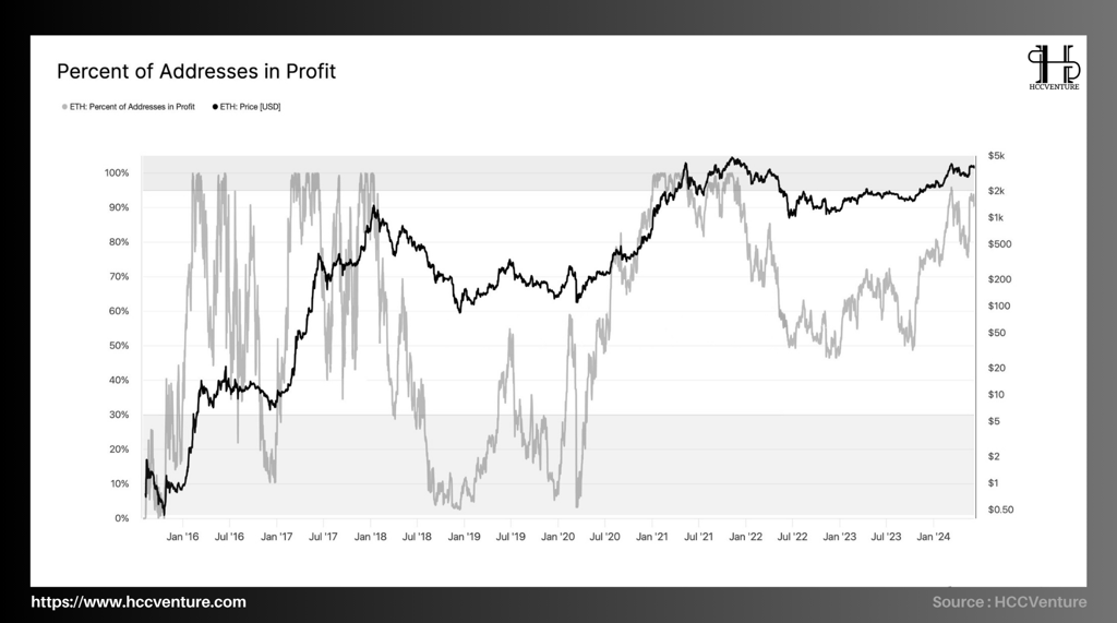 The percentage of addresses in profit is one of the most reliable measures of trend “ breadth ” on the Ethereum blockchain. The more addresses in profit, the higher the likelihood of a sustainable price base forming as forced selling pressure decreases.