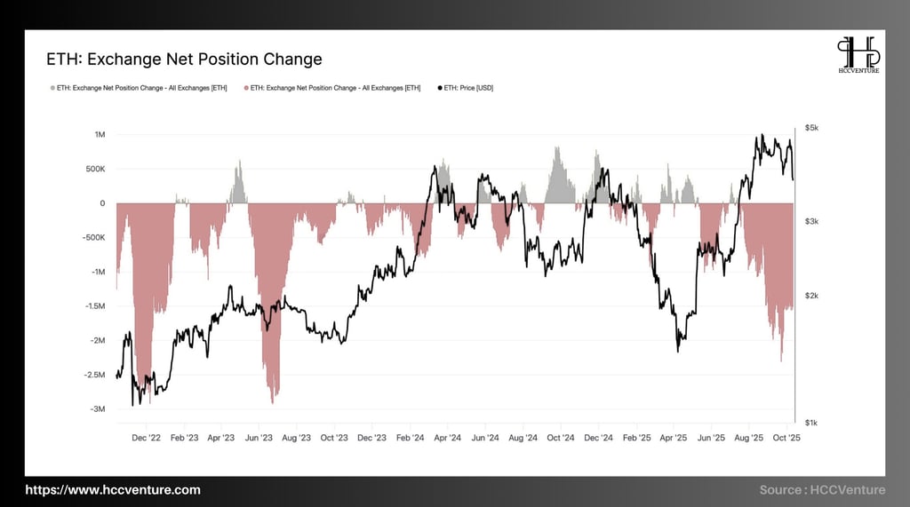 The end of 2022 recorded about -2.8 to -3.0 million ETH/30D (system panic bottom). The key difference is that the price dropped deeply at that time , while the current high price is stable , showing that the net withdrawal motive is long-term accumulation/holding , not withdrawal due to concerns about floor risks.