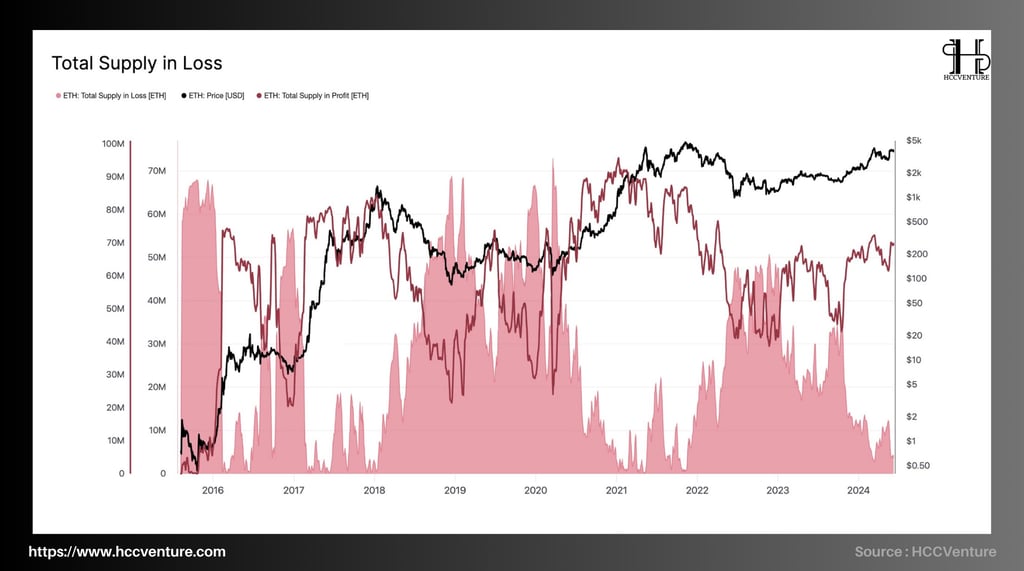 Total Supply in Loss measures the total amount of ETH that is priced higher than the current price. This is an indicator of the “depth” of potential selling pressure. The lower the “depth”, the smaller the overhang and the stronger the underlying trend.