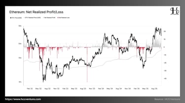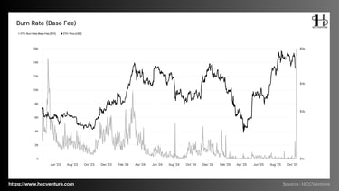 Fee Ratio Multiple (FRM) and Burn Rate (Base Fee) are meaningful. FRM continues to stay above the 10–12x range, showing a high level of fee income relative to network security value, while the burn remains steady, although not as explosive as during DeFi Summer.