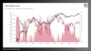 Total Supply in Loss has contracted to cycle lows , while prices remain elevated—a configuration that only occurs when holding demand prevails. During historical bottoms (2018–2020; early 2023), the fraction of supply in profit fell very low, implying that the majority of supply was in a loss . In contrast, the current timeline on the same dataset shows the fraction in profit approaching its maximum , causing Total Supply in Loss to contract to its minimum margin. This means:
