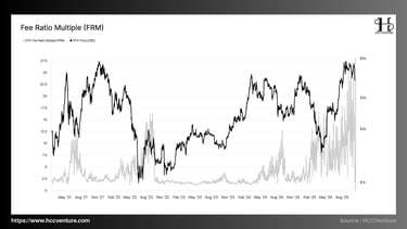 Low FRMs typically occur when L1 fees are explosive (e.g., 2021 peaks), implying euphoric risk. Conversely, high FRMs reflect a low share of L1 fees in total security spend ; post The Merge and EIP-4844, this is the new normal as activity shifts to L2/blobs , making unit costs for users cheaper but consolidated security revenue resilient.