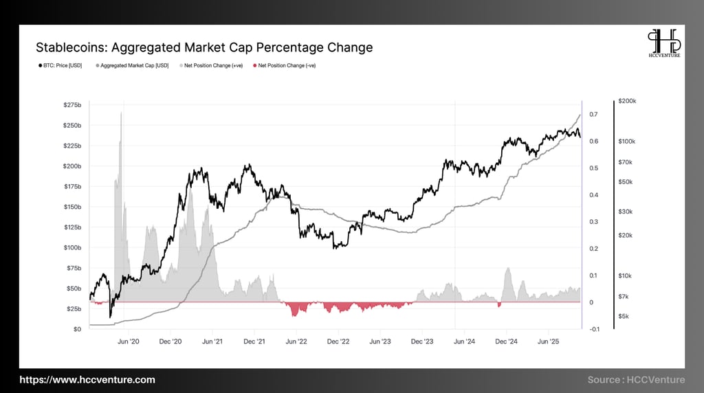 The steady increase in stablecoin capitalization throughout the second half of 2024 and maintaining a positive growth rate into the fourth quarter of 2025 represents a sustainable recovery of USDized capital flows, acting as liquidity fuel to support the new growth cycle of Bitcoin and risk assets.