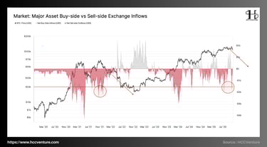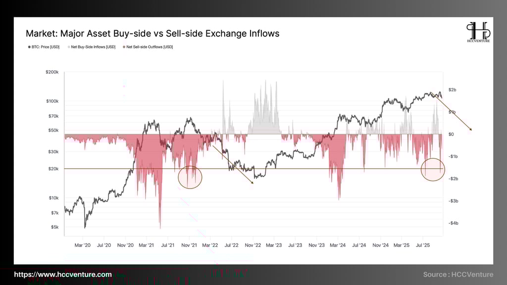 The Buy-side vs Sell-side Exchange Inflows indicator reflects the difference between the amount of capital deposited into the exchange for selling and the amount of capital withdrawn for long-term holding. Looking at the latest data, the period from late Q3 to early Q4/2025 , the Bitcoin market is witnessing a strong negative outflow , similar to the correction phases of 2021 and 2022.