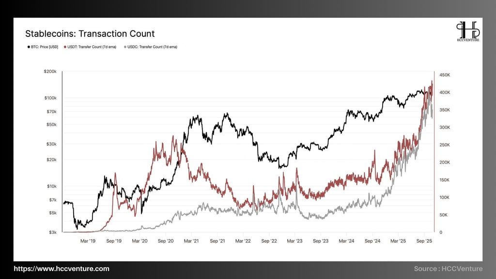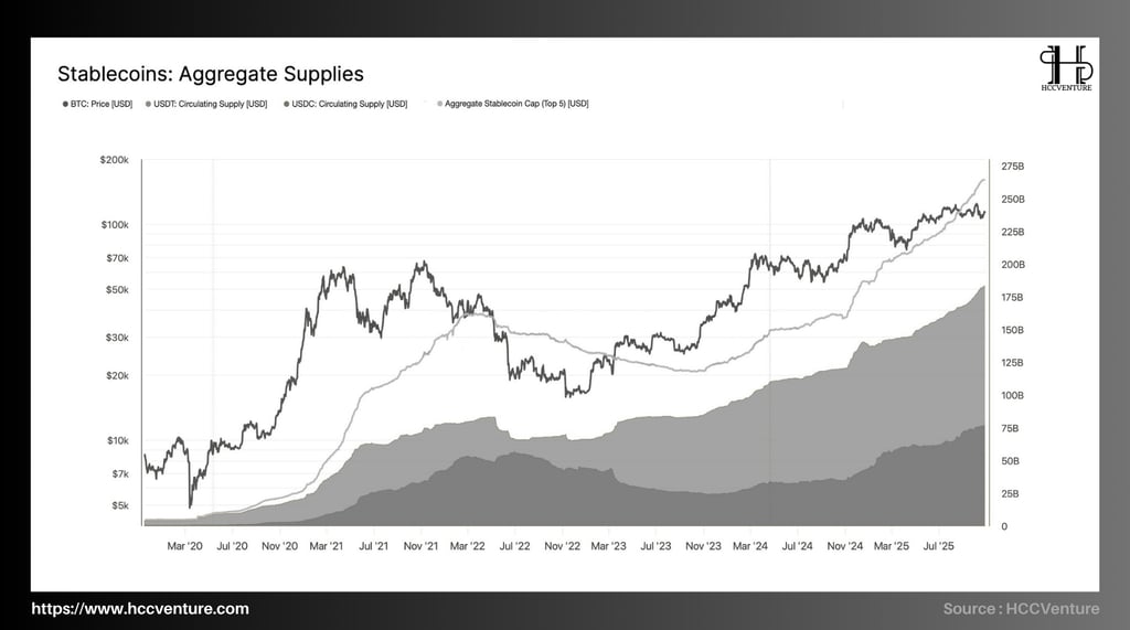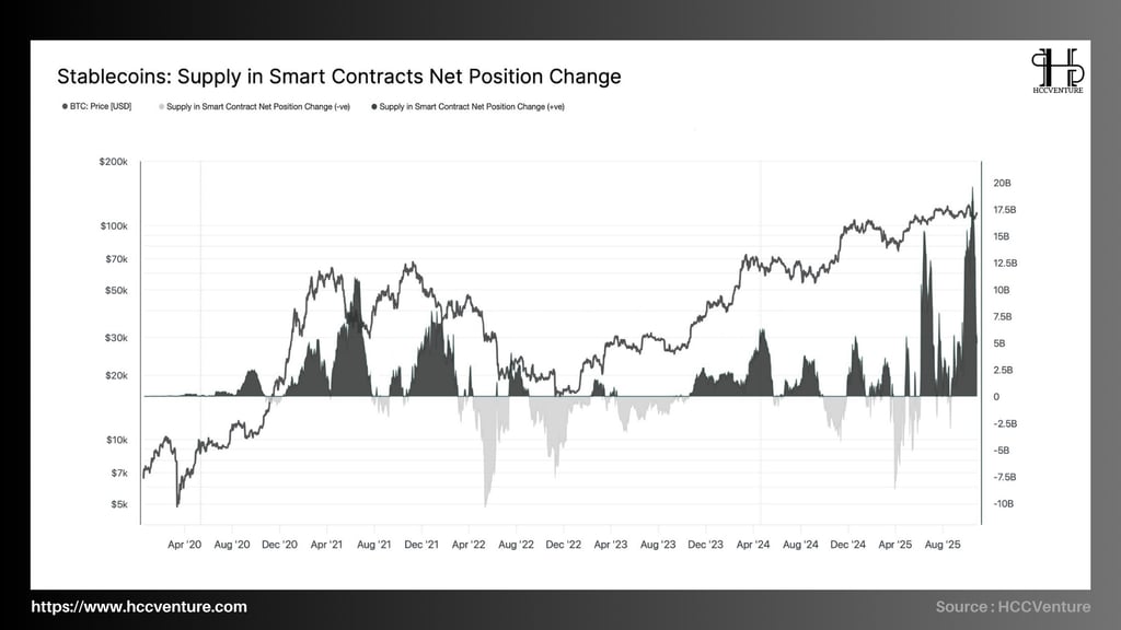 In terms of cycles, Bitcoin's sustained bull run has always been accompanied by stablecoin expansion ( 2019→2021, 2023→2025 ). The difference in this cycle is that USDC has accelerated strongly alongside USDT , implying increased institutional/fintech participation along with global retail capital flows.