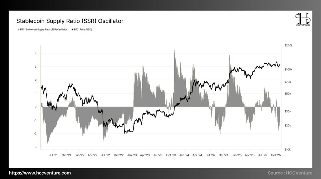 Compared to the 2020–2021 bull run, SSR remains in a positive range of +1 to +3 , indicating that the majority of stablecoin supply has been converted into spot capital. In contrast, in the current cycle (Q3–Q4/2025), the SSR index continues to be in a deep and stable negative range, reflecting that a large amount of stablecoins are still “anchored ” in wallets or smart contracts, not yet heavily disbursed into Bitcoin.
