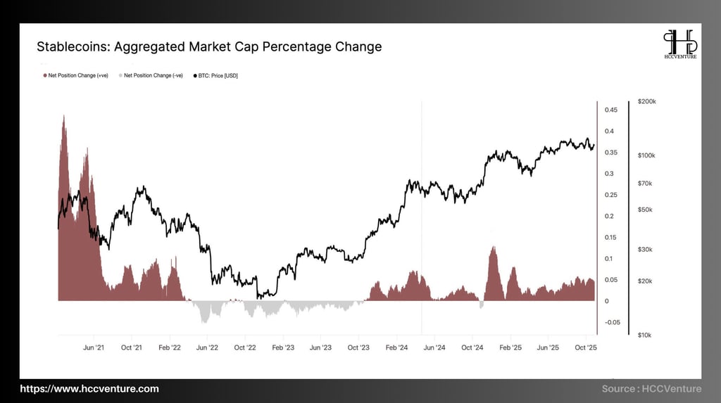 The Aggregate Market Cap Change Rate reflects the percentage change in the total market capitalization of major stablecoins ( USDT, USDC, DAI, TUSD, BUSD, etc. ) over time. It is one of the most sensitive indicators for measuring liquidity flows into or out of the crypto market, which in turn has a direct correlation with the price movements of Bitcoin and risky assets.