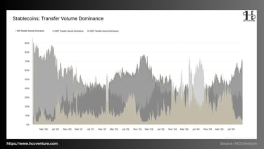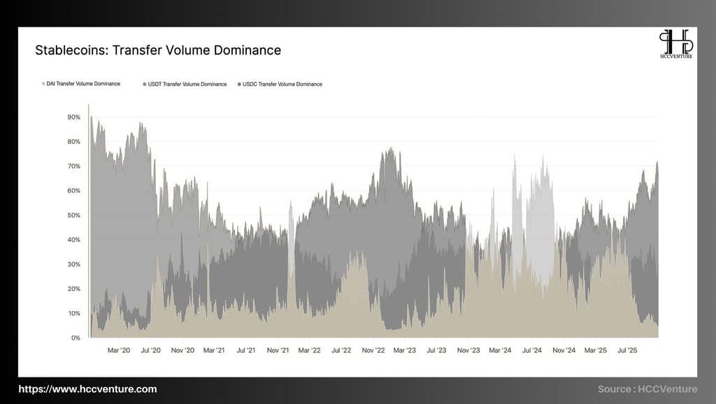 From early 2020 to late 2025, on-chain data shows USDT consistently dominating in terms of absolute transaction volume, with a peak in early 2020 reaching over 90% of total stablecoin transaction volume. However, this trend will gradually change as USDC and DAI expand their market share, especially in 2022–2024, when the DeFi market recovers strongly and the demand for transparent liquidity increases.