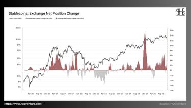 Stablecoin withdrawals from exchanges – often signal periods of accumulation or correction. For example, Q2 2022 saw outflows of -$6 billion , accompanied by a sharp drop in Bitcoin from $47,000 to $17,000. The current data is in stark contrast to that backdrop, with stablecoin capital returning to the market at its strongest level since 2021.