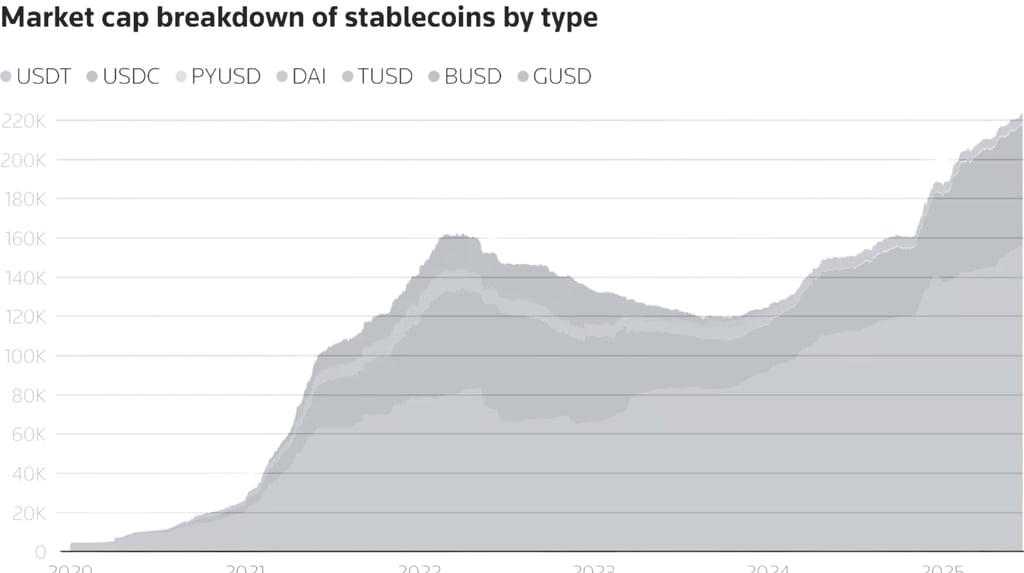 Much of this market value is concentrated in tokens pegged to the US dollar, such as Tether and USD Coin, which together dominate the global stablecoin circulation.