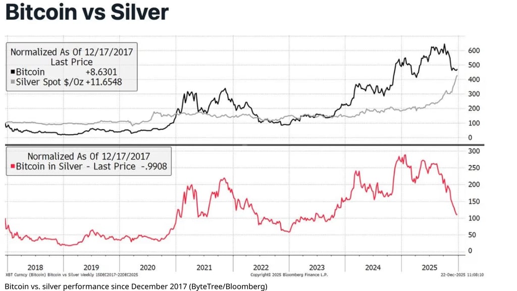 A widely circulated report from Bloomberg Commodities Desk (January 28, 2026) drew attention to a remarkable long-term performance comparison: since Bitcoin's all-time high in December 2017 ( $19,783 ), physical silver has yielded higher percentage returns than Bitcoin when measured in US dollars.
