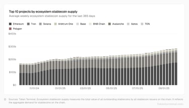 Sự thống trị của stablecoin Ethereum bắt nguồn từ năm 2015 với tư cách là đơn vị tiên phong về hợp đồng thông minh, nhưng bản nâng cấp Dencun (tháng 3) trong giai đoạn 2024-2025 đã cắt giảm 90% phí L2, mở khóa thông lượng song song cho các stablecoin khối lượng lớn. Điều này trái ngược với tốc độ dễ bị gián đoạn của Solana hay kho USDT của Tron: Kho dự trữ 165 tỷ đô la của ETH chiếm 80% khối lượng DeFi, từ cho vay Aave đến hoán đổi Uniswap. Dấu ấn của các tổ chức rất nhiều - quỹ BUIDL của BlackRock đã token hóa 500 triệu đô la trái phiếu kho bạc trên ETH, trong khi Onyx của JPMorgan điều hành các giao dịch thanh toán stablecoin.