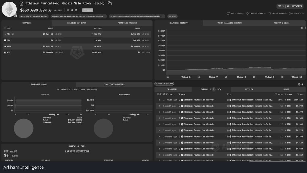 Vào ngày 21 tháng 10 năm 2025, dữ liệu blockchain cho thấy Quỹ Ethereum đã chuyển khoảng 160.000 ETH (khoảng 654 triệu đô la) đến một địa chỉ ví trước đó đã bị công ty phân tích Arkham Intelligence đánh dấu vì các giao dịch "bán tháo" hoặc liên quan đến các sàn giao dịch.