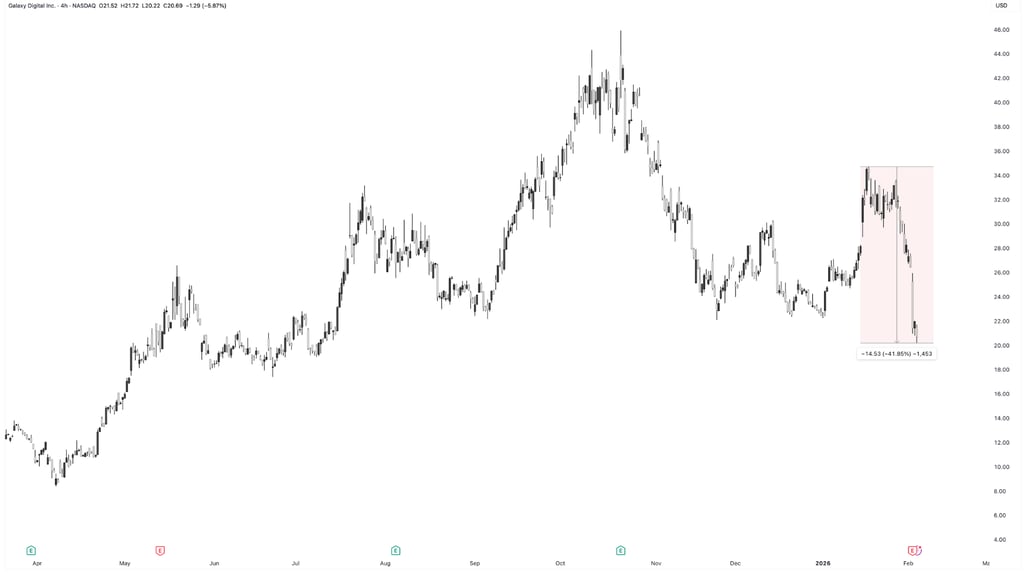 Cổ phiếu của Galaxy Digital Holdings (TSX: GLXY | OTCQX: BRPHF) đã giảm mạnh trong phiên giao dịch trước giờ mở cửa và đầu giờ giao dịch ngày 3 tháng 2 năm 2026, sau khi công ty báo cáo khoản lỗ ròng 482 triệu đô la trong quý IV năm 2025 — khoản lỗ hàng quý lớn nhất kể từ thị trường gấu năm 2022.