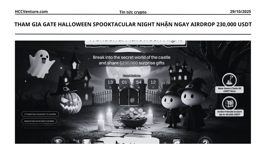 Sự kiện diễn ra từ 09:00 UTC ngày 28/10/2025 đến 16:00 UTC ngày 11/11/2025, mang đến không khí Halloween huyền bí với hình ảnh lâu đài cổ, ma quái và kho báu ẩn giấu. Bạn sẽ đóng vai "chiến binh" khám phá hành lang mờ ảo, mở cửa bí ẩn để thu thập kẹo – nhưng cẩn thận, có thể gặp ma và mất năng lượng! Sự kiện được thiết kế vui nhộn, dễ chơi trên cả web và app Gate, phù hợp cho mọi người dùng.