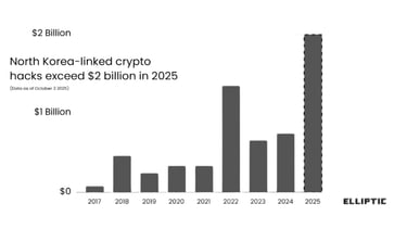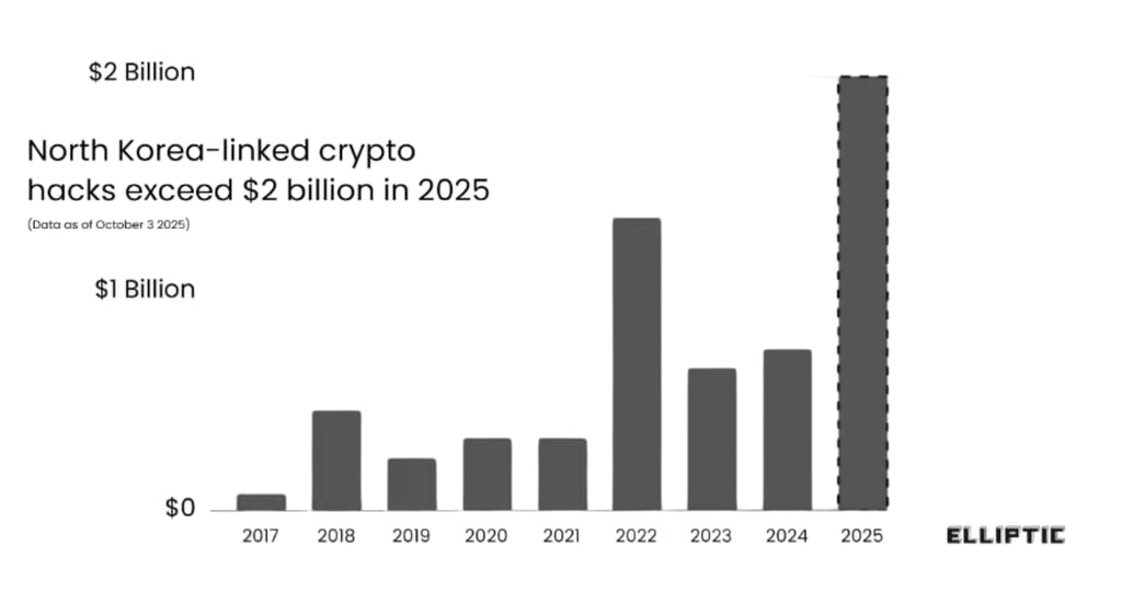 Theo một báo cáo chấn động từ công ty phân tích blockchain Elliptic, các tin tặc được nhà nước Triều Tiên bảo trợ, dẫn đầu bởi nhóm Lazarus Group khét tiếng, đã đánh cắp một lượng tiền điện tử khổng lồ lên tới 2 tỷ đô la tính đến thời điểm hiện tại của năm nay - vượt xa kỷ lục hàng năm trước đó 48% và gần gấp ba lần con số 742,8 triệu đô la của năm 2024.