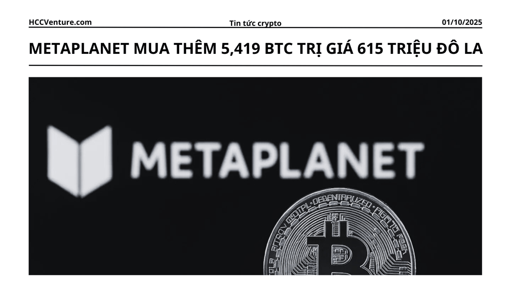 Metaplanet mua thêm 5,419 BTC trị giá 615 triệu đô la
