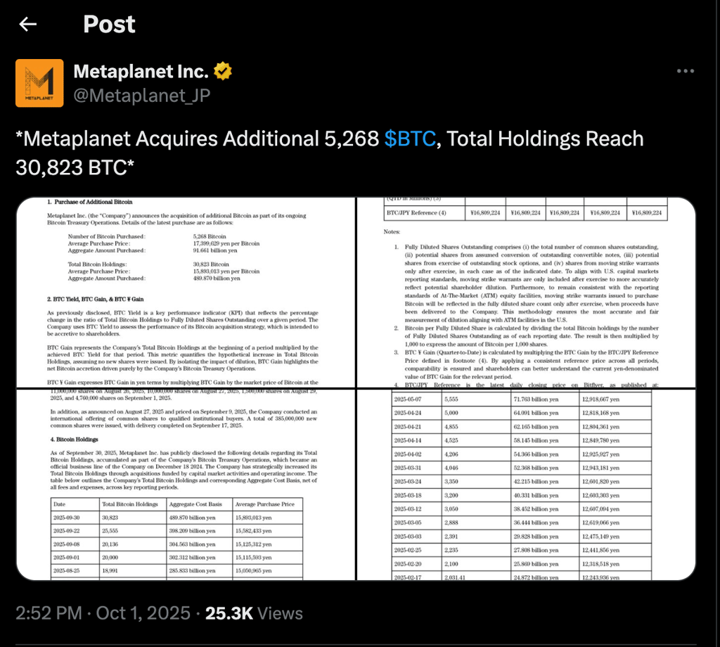 Metaplanet Inc. của Nhật Bản đã củng cố vị thế là công ty quản lý quỹ Bitcoin hàng đầu châu Á, mua lại 5.268 BTC với giá khoảng 615,67 triệu đô la Mỹ, với mức giá trung bình 116.870 đô la Mỹ/BTC. Thương vụ mua lại mới nhất này đã nâng tổng số BTC mà công ty niêm yết tại Tokyo nắm giữ lên 30.823 BTC, trị giá hơn 3,6 tỷ đô la Mỹ, đưa công ty trở thành đơn vị nắm giữ Bitcoin lớn thứ tư trên toàn thế giới, vượt qua các đối thủ như Marathon Digital và Riot Platforms.