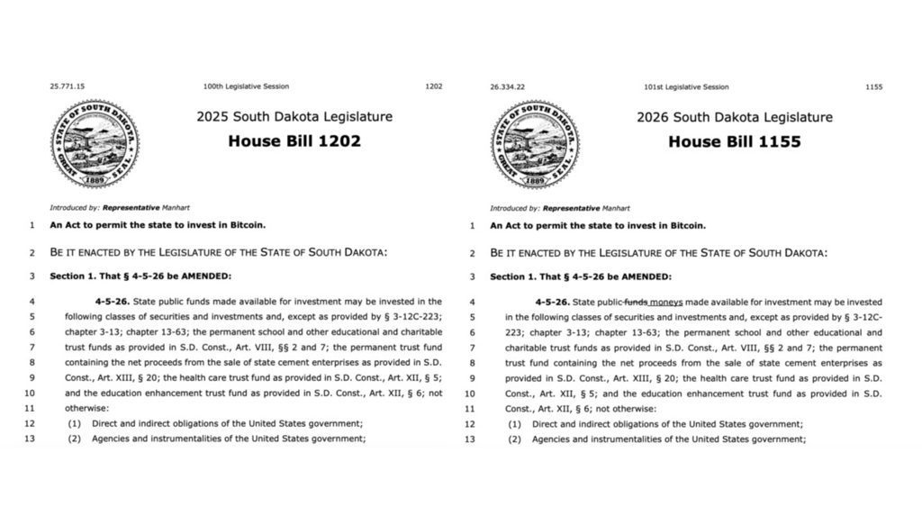 Một nhà lập pháp tiểu bang Nam Dakota đã tái trình dự luật cho phép các quỹ đầu tư của tiểu bang — bao gồm cả Hội đồng Đầu tư Nam Dakota (SDIC) — phân bổ một phần tài sản lương hưu và ủy thác công cộng vào Bitcoin. Dự luật, HB 1215 (có tiêu đề “Đạo luật cho phép đầu tư vào Bitcoin bởi một số quỹ của tiểu bang”), được Hạ nghị sĩ Tom Pischke (R-25) đệ trình vào ngày 27 tháng 1 năm 2026 và được đồng bảo trợ bởi một số đồng nghiệp đảng Cộng hòa.
