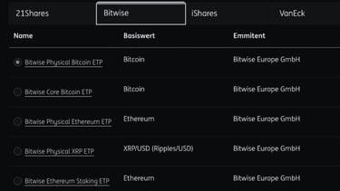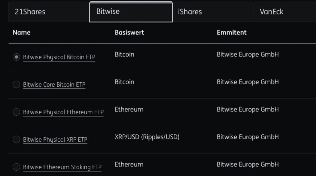 Theo các báo cáo, chi nhánh tại Đức của ING đang mở rộng danh mục sản phẩm giao dịch trên sàn tiền điện tử (ETP) và chứng khoán giao dịch trên sàn (ETN) thông qua hợp tác với Bitwise và VanEck.