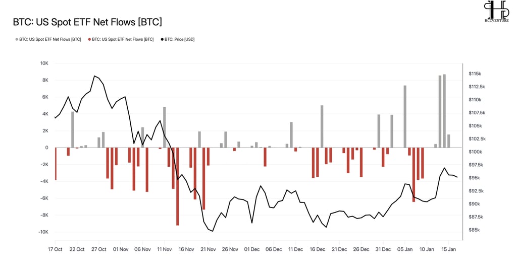 Trong các tuần trước đó, mỗi nhịp outflow từ ETF thường đi kèm với giá giảm rõ rệt. Nhưng trong tuần đầu 2026, ngay cả khi có phiên outflow, giá BTC không rớt mạnh, và sau đó hồi phục khi inflow xuất hiện. Nhà đầu tư tổ chức dường như coi Bitcoin ETF như công cụ đầu tư chiến lược ban đầu trong đầu năm mới. Biến động giá không phản ánh áp lực bán từ ETF như trước. Điều này biểu thị dòng tiền có tính ổn định và tích lũy, thay vì hoảng loạn rút vốn.